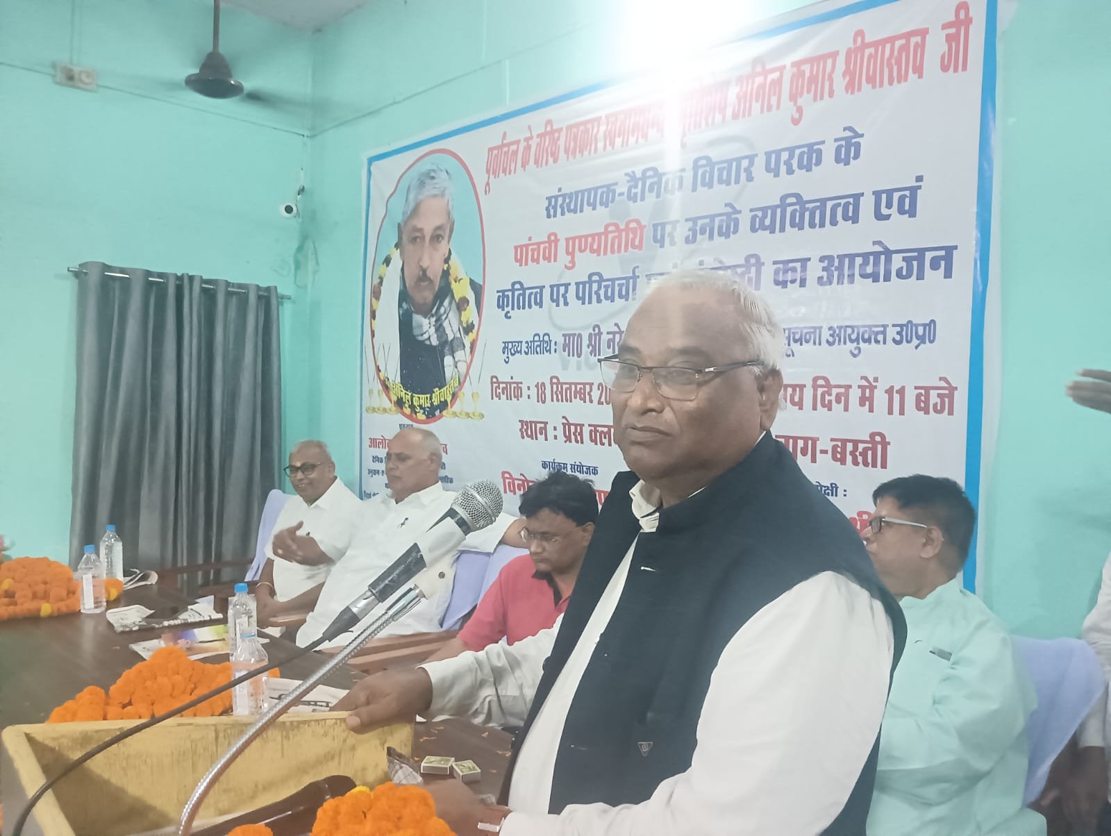 सक्रिय भूमिका निभाते है। आज प्रेस क्लब के सभागार में पूर्वाचल के वरिष्ठ पत्रकार स्व0 अनिल कुमार श्रीवास्तव की पांचवी पुण्यतिथि पर आयोजित गोष्ठी को सम्बोधित करते हुए । मुख्य अतिथि पूर्व राज्य सूचना आयुक्त नरेन्द्र कुमार श्रीवास्तव ने कहा है कि पत्रकार समाज को हमेशा सही दिशा देता है और लोगों को सही राह दिखाता है। पत्रकारिता लोक तंत्र का चौथा स्तम्भ है जो शासन प्रशासन को जबाब देह बनाने के साथ-साथ जनता की आवाज को मंच प्रदान करता है पत्रकारिता का मूल उद्देश्य सत्य, निष्पक्षता और जनहित की रक्षा करना है और ये सभी गुण स्व0 अनिल कुमार श्रीवास्तव में समाहित था। उन्होंने सरलता और सादगी को अपनाकर एक बहुत बड़ा व्यक्तित्व का निर्माण किया था उनके आदर्शाे पर चलकर बस्ती जनपद के कई लोगों ने पत्रकारिता का ककहरा सीख कर देश और दुनिया में अपना नाम रोशन कर रहे है। समय पालन और समाचार सम्प्रेषण जिसमें वे पूरी सजकता रखते थे। वो बस्ती जनपद ही नही बल्कि पूर्वाचल में एक सकारात्मक पत्रकारिता के महत्वपूर्ण, मजबूत स्तम्भ के रूप में जाने