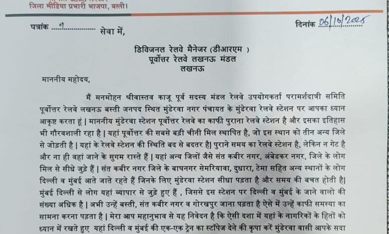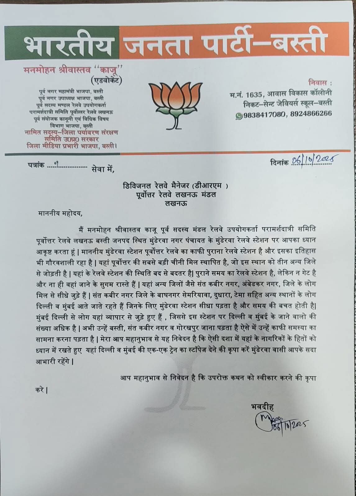 बस्ती। वरिष्ठ भाजपा नेता व अधिवक्ता मनमोहन श्रीवास्तव ‘काजू’ ने मुंडेरवा रेलवे स्टेशन पर दिल्ली और मुंबई की ट्रेनों के स्टॉपेज तथा स्टेशन को मॉडल स्टेशन के रूप में विकसित किए जाने की मांग की है। इस संबंध में उन्होंने पूर्वोत्तर रेलवे लखनऊ मंडल के डिविजनल रेलवे मैनेजर (डीआरएम) को पत्र भेजा है।उन्होंने कहा कि मुंडेरवा चीनी मिल पूर्वांचल की सबसे पुरानी और सर्वाधिक उत्पादन क्षमता वाली मिलों में से एक है, जहां हजारों लोगों को प्रत्यक्ष और अप्रत्यक्ष रूप से रोजगार प्राप्त है। इस क्षेत्र से बड़ी संख्या में लोग मुंबई और दिल्ली रोजगार व व्यवसाय के उद्देश्य से नियमित रूप से आते-जाते रहते हैं।