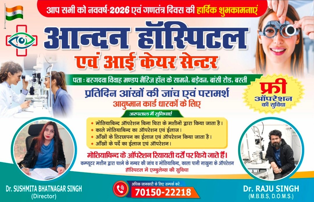बस्ती। नववर्ष 2026 के अवसर पर आनंद हॉस्पिटल एवं आई केयर सेंटर द्वारा जनपद बस्ती के नागरिकों को हार्दिक शुभकामनाएं दी गईं। इस मौके पर केंद्र की निदेशक डॉ. सुष्मिता भटनागर सिंह एवं नेत्र रोग विशेषज्ञ डॉ. राजू सिंह (एम.बी.बी.एस., डी.ओ.एम.एस.) ने बस्तीवासियों के सुखद, स्वस्थ और सुरक्षित जीवन की कामना की।