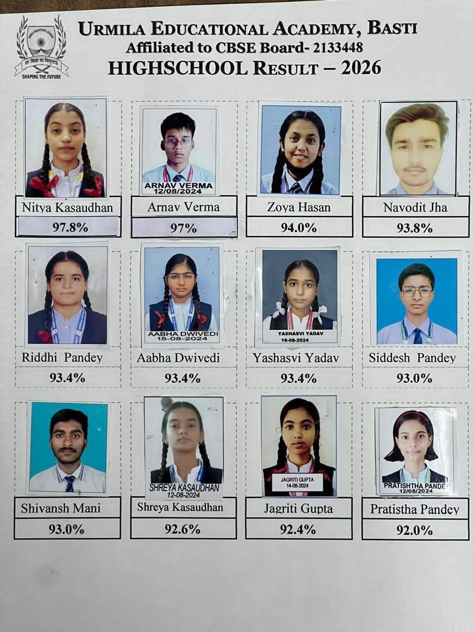 उर्मिला एजुकेशनल एकेडमी में आज कक्षा 10वीं का परीक्षा परिणाम केंद्रीय माध्यमिक शिक्षा बोर्ड (सीबीएसई) द्वारा घोषित किया गया। विगत वर्षों की भांति इस वर्ष भी विद्यालय के विद्यार्थियों ने उत्कृष्ट प्रदर्शन करते हुए सफलता का परचम लहराया। इस बार विद्यालय का परीक्षा परिणाम अत्यंत सराहनीय रहा।